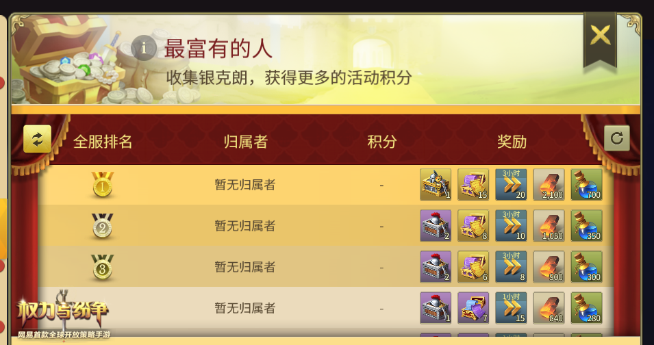 以收集建材为例,在活动开启之后,领主们可以通过建材加工厂生产、开启建材宝箱、进行贸易积累活动积分,除此之外,勇敢的领主更能通过掠夺玩家或者NPC的建材来增加活动积分!同样的,在收集银克朗的活动中,领主们也可以通过活动指定的途径达成任务并获取活动积分。在达成所有目标阶段、领取丰厚奖励的同时,玩家所累积的积分还能冲击排行榜,让领主成功登上王国排行、全服排行,在其他领主面前展现自己雄厚的资源实力!在排行榜上位列前茅的玩家更有机会获得排行榜大奖——5阶装备、装备宝箱、信物礼盒、技能残页礼包、 通用加速道具,锻造炉燃料,洗礼之水等丰富奖励等你来拿!